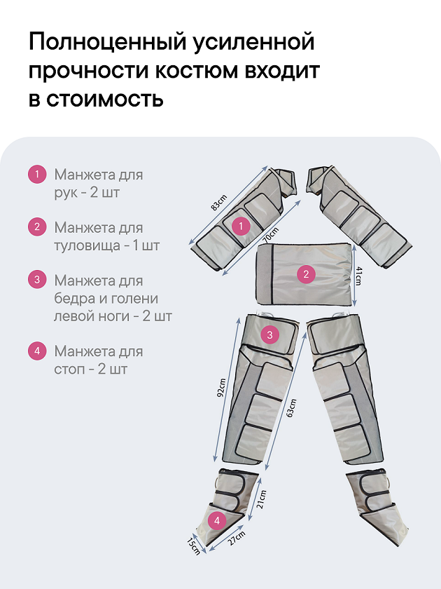 • Костюм на все тело, 20 электродов и комплект бандажей входит в комплектацию прибора!